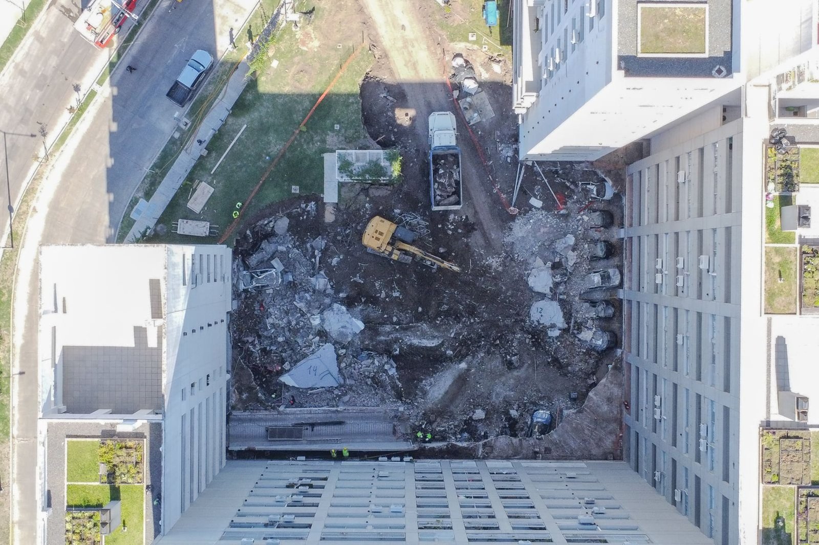 La vecina sumó además que continúa pendiente la situación de los vehículos afectados por el derrumbe y que, según lo que conversan entre residentes, podría requerirse intervención de compañías de seguros para verificar el estado de los autos. “Las aseguradoras piden documentación de los autos. Pero seguramente van a mandar a ver. El lugar está cerrado por policías. Es la fiscal la que determina seguir la obra de reconstrucción”, afirmó.