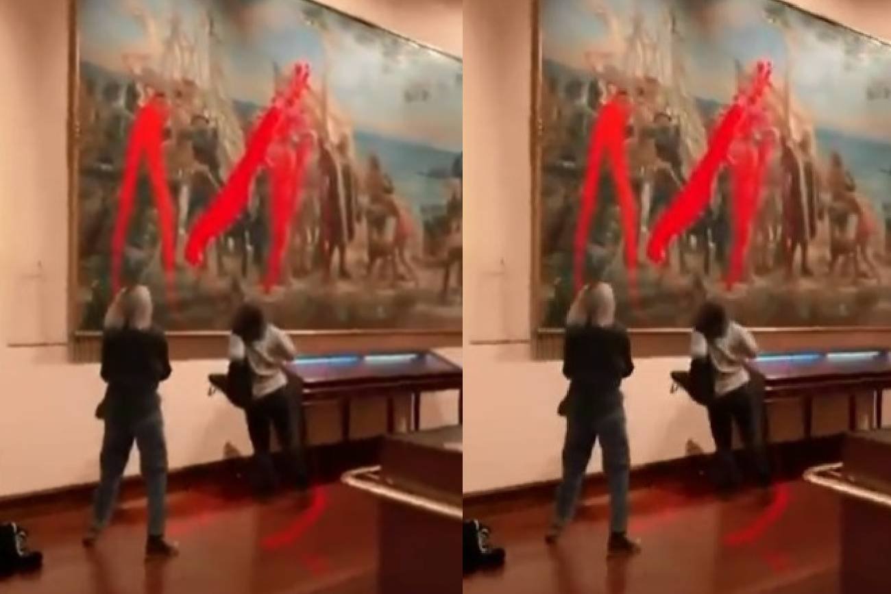 Activistas arrojaron pintura roja sobre un cuadro de Cristóbal Colón en Madrid
