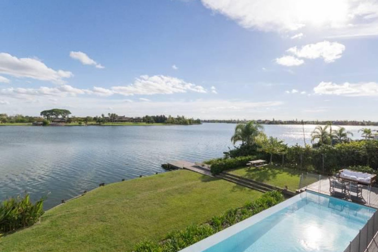 El área exterior refuerza la propuesta de lujo: dos galerías, parrilla y cocina al aire libre, una piscina sin fin de 56 m² climatizada y con nado contra corriente, y un muelle privado con bajada para bote, todo enmarcado en una vista abierta al lago principal y al green.