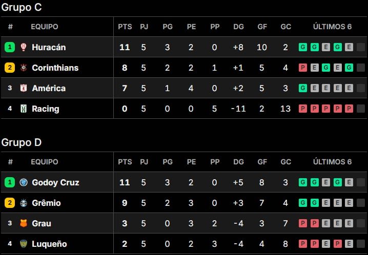 El Globo empató 0 a 0 con América de Cali y quedó primero en el grupo C, el Tomba igualó 1 a 1 con Gremio y se mantiene en lo más alto de la zona D, y el Granate derrotó por 1 a 0 a Vasco da Gama y se aseguró el primer puesto del grupo G. El Tatengue, por su parte, perdió por 1 a 0 con Mushuc Runa y se despidió del certamen. Por otro lado, el Halcón de Florencio Varela empató 1 a 1 con Universidad Católica de Ecuador y está tercero en la zona B. Por último, el Rojo quedó como líder del grupo A al vencer a Guaraní por 1 a 0.