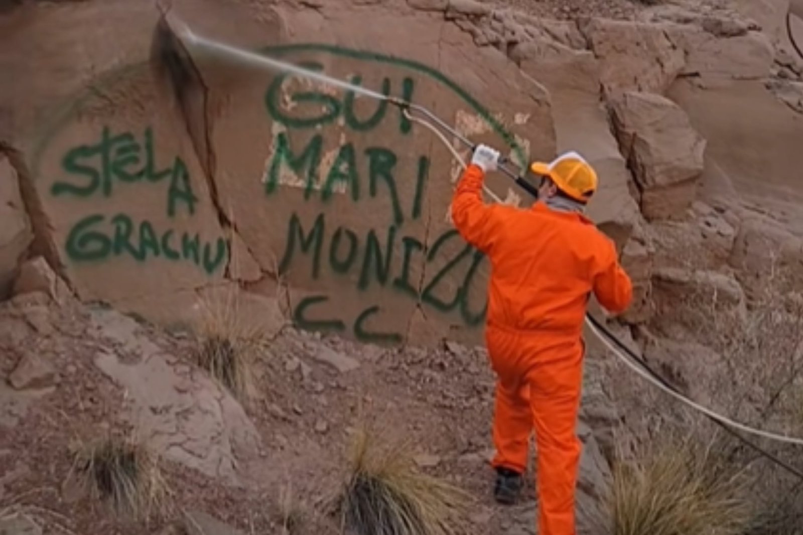 En un video compartido por la Fundación Pro Montaña, se vio a un trabajador vestido de mameluco naranja removiendo la pintura verde de la roca de la montaña con una hidrolavadora. “Las pintadas no se borran solas, la basura no vuelve sola. Si vas a la montaña no tires nada, llevate todo”, escribió en TikTok la primera asociación mendocina dedicada a erradicar las pintadas vandálicas de las montañas y a la recolección de residuos de zonas inaccesibles.