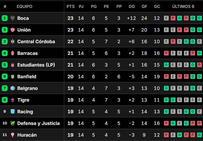 En la zona A, el xeneize se impuso a Estudiantes en La Plata 2 a 1 y comanda con 21 puntos junto a Unión de Santa Fe, que doblegó a Newell’s en Rosario 1 a 0. El elenco porteño está por encima porque tiene mejor diferencia de goles (+12 contra +7). Central Córdoba de Santiago del Estero igualó con Racing 0 a 0 y cayó al tercer lugar con 22 unidades, una más que Barracas Central que superó a Argentinos Juniors 2 a 0. En la misma línea quedó el Pincha y Banfield subió hasta el sexto puesto gracias a su alegría en el clásico sobre Lanús 2 a 1.