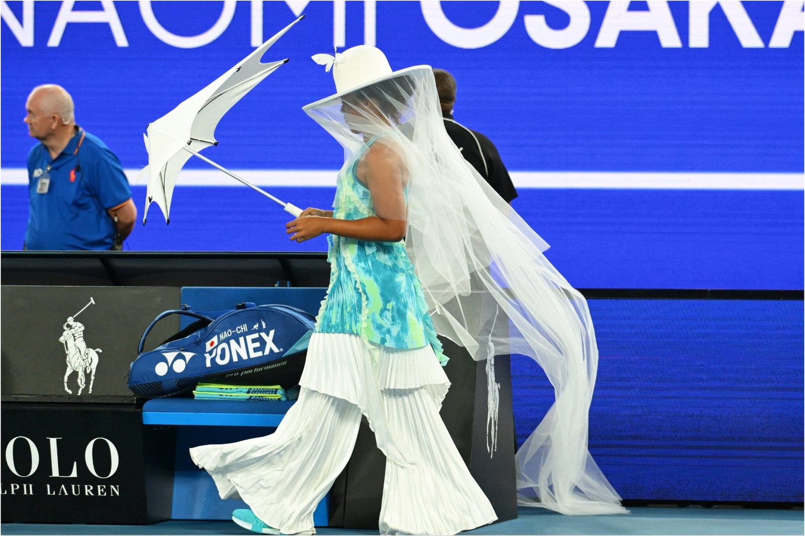 Con una túnica larga de color turquesa, inspirada en una medusa, Osaka completó su look con unos pantalones arrugados totalmente blancos, un sombrero blanco de ala ancha, el cual tenía el detalle de una gran mariposa del mismo color en la parte superior, y un paraguas, a tono.