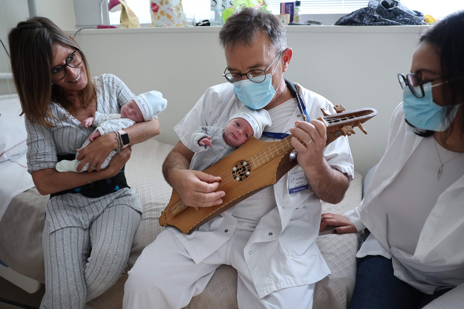 El hombre se llama Bruno Menager, es jefe del departamento de pediatría del hospital Nuestra Señora de la Misericordia en Ajaccio, Córcega, y la música que no podemos escuchar nace de una cítola, un instrumento antiguo cuyo nombre y forma exacta se pierden en el medioevo. Hay dos miradas en la foto: la de Emmanuelle Prieto, esposa de Menager que, a su izquierda, lo acompaña y sonríe; y la del recién nacido que el médico sostiene mientras despliega su pequeño concierto. El bebé –los ojos abiertos– más que mirar, siente de un modo que pronto olvidará; todavía su mundo no está ordenado por la visión, sino por la confluencia de estímulos irrepetiblemente nuevos. Los siglos que evocan las cuerdas de la cítola, el mismo Mediterráneo donde este niño pronto se bañará: hay un movimiento aquí que lo mece, lo acuna, le dice sin palabras que es bienvenido.