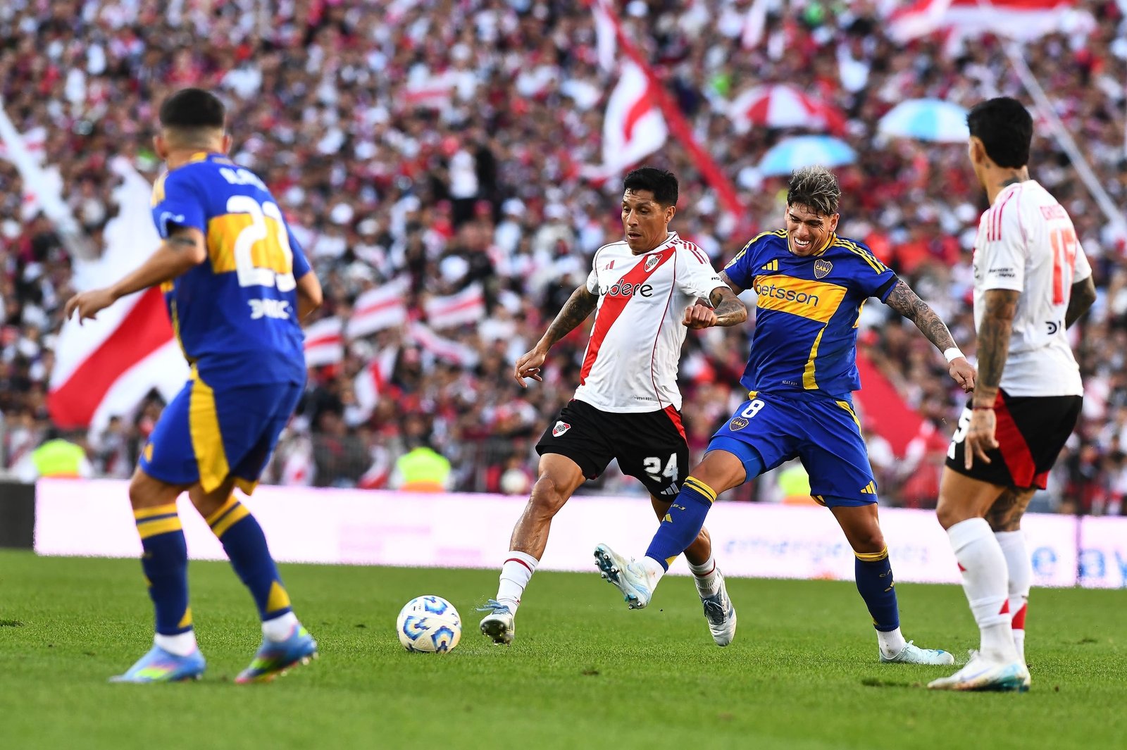 A diferencia del “arte” para marcar de Enzo Pérez, los futbolistas de Boca vieron tres amarillas con apenas cuatro infracciones. Es cierto que la primera de Belmonte pareció exagerada de parte del árbitro Ramírez por una falta sobre Colidio, pero después cada topetazo o infracción no sólo le daban a River posibilidades de centros sino que finalizaban con una amarilla o con un riesgo de amonestación. Así vio la amarilla Costa por una entrada lejos a Castaño, Rojo (sobre Driussi), Advíncula (nacida de un error propio en una salida y tras una falta a Mastantuono), La amonestación de Battaglia fue por protestar.