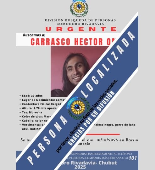 “Se le informa a la comunidad que el ciudadano Héctor Omar Carrasco fue encontrado en buen estado de salud. Por favor, se ruega eliminar la foto de las redes sociales. Se agradece su colaboración y difusión”, expresó la división en su cuenta de Facebook, donde dio el mismo contexto sobre Luciano Vivar.
