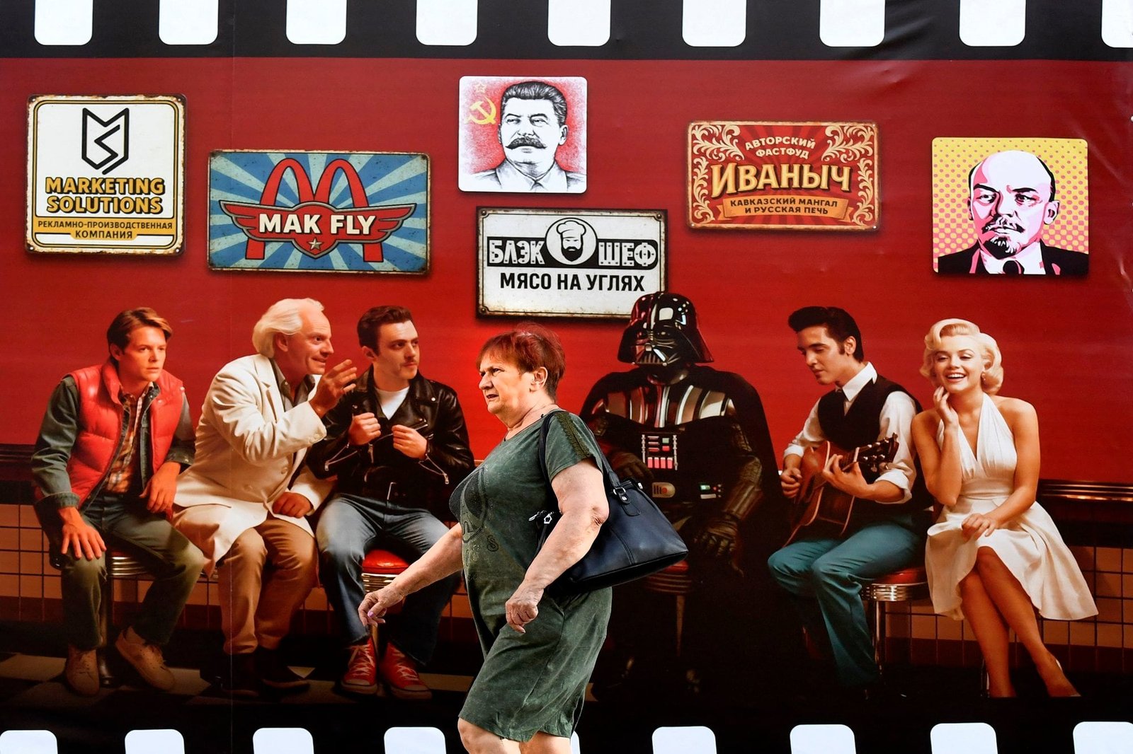 En esta imagen hay tres niveles. En primera línea, la señora que avanza, vestida como podría estarlo cualquier mujer en cualquier rincón del mundo occidental, sin mirar siquiera el estallido pop que asoma en la segunda línea: Marilyn, Darth Vader y Doc Brown en alegre convivencia con Stalin y Lenin. La señora, quizás vecina del lugar, pasa frente al restaurante Mak Fly (¿homenaje a Marty McFly, el protagonista de Volver al futuro?), especializado en hamburguesas y papas fritas, y abierto sobre la Avenida Lenin, en la zona bajo control ruso de Mariúpol, ciudad portuaria que la comunidad internacional sigue reconociendo como ucraniana. Aquí viene entonces el tercer nivel de la foto: la liviandad juguetona del gesto pop (Lenin, psicodelia y el jopo de Presley), incrustada en territorio de tragedia. Mariúpol es escenario de guerra y, a la vez, de contrastes indescifrables. Cultura