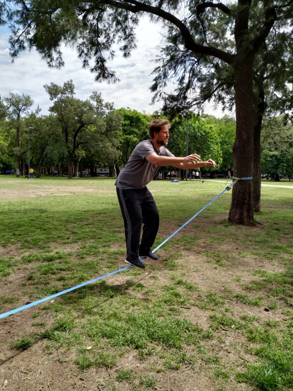 Martín Sangougnet es licenciado en Alimentos, hace slack desde 2018 y actualmente dicta clases en el grupo Slackline Natural, que se reúne los domingos, de 11 a 13, cerca del Rosedal de Palermo. También practicó en otros lugares como Parque Saavedra y la costa del río, en Vicente López.
