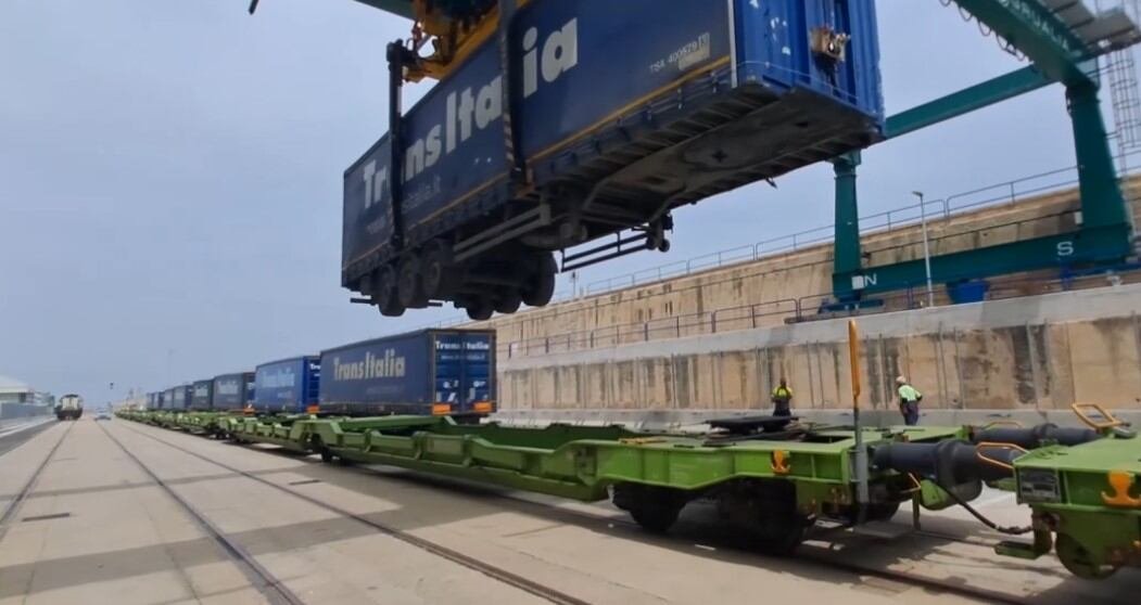 Cuando llegan los camiones a Valencia, se descargan en el puerto. Una sola cabeza tractora (la parte delantera del camión) agarra los semirremolques (la parte trasera) recién descargados del buque, y los va colocando en fila, en paralelo a la vía del tren. La grúa, una enorme máquina verde, se coloca al inicio de las vías. Arranca sus motores una hora antes de que llegue el tren de mercancías. Abajo, dos operarios esperan pacientes, preparados para acompañar al monstruo de metal en su labor. El convoy, previsto para las 12.30, llega finalmente una hora más tarde. La locomotora se desengancha al entrar en el puerto y desde ahí la sustituye una máquina de maniobras. Se acerca hasta el principio de la vía, donde la grúa aguarda, deja los vagones en el punto exacto, se desengancha y se va.
