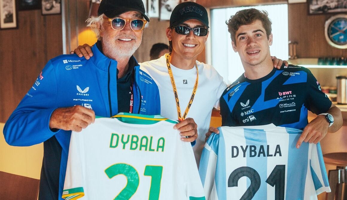 La visita de Dybala tuvo un condimento especial al acercarse al box de Alpine, donde se encontró con Colapinto y también con Flavio Briatore, asesor del equipo. La foto entre los tres, tomada en medio de un clima tenso por las críticas del directivo italiano al piloto argentino, dio la vuelta al mundo.