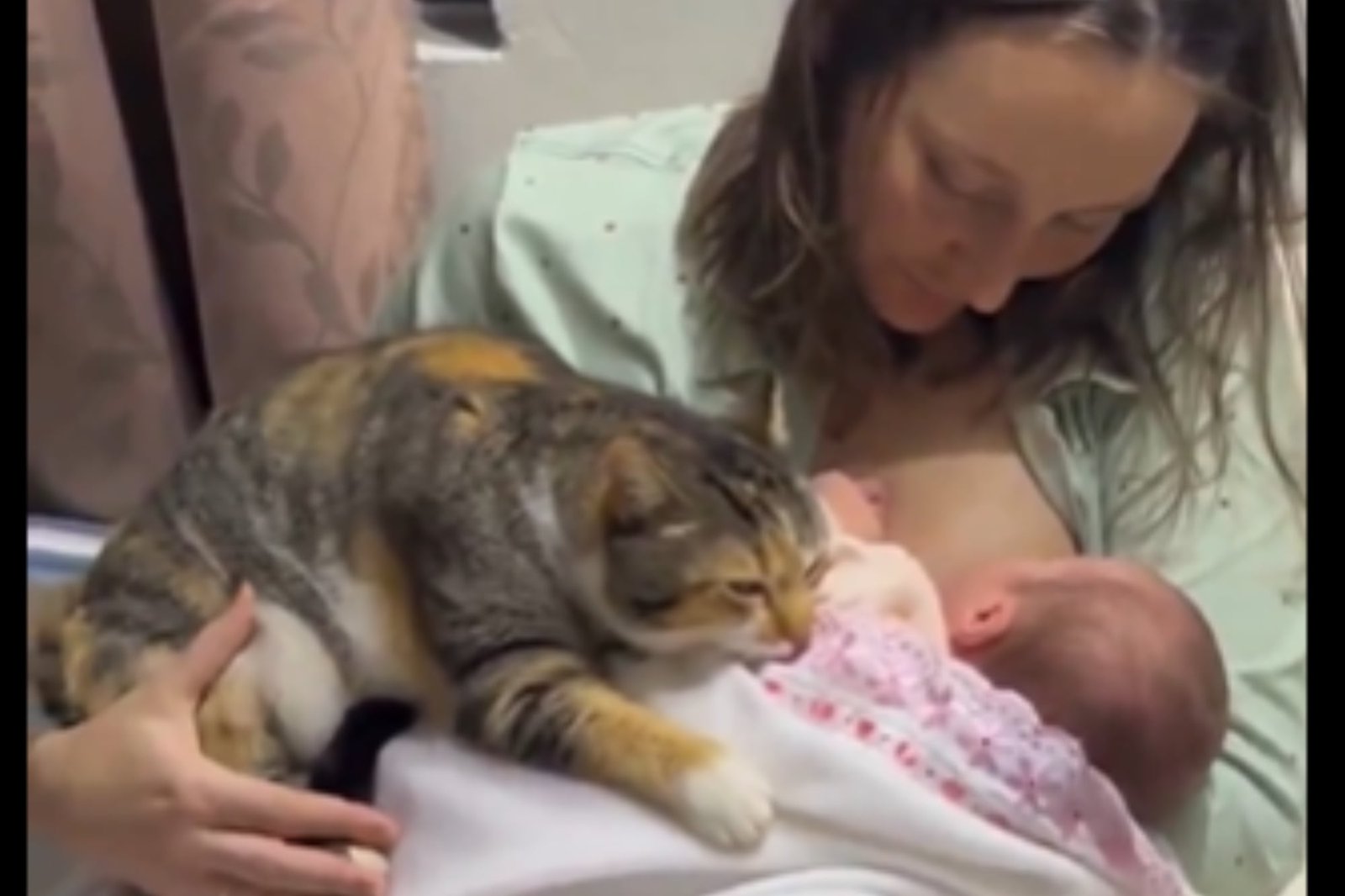 El video, que dura más de dos minutos, es una interacción muy tierna entre los tres: el gato, la madre y el bebé recién nacido. Ahí se puede ver el gato aúpa de la mamá, intentando conocer y socializar con el bebé. En varios momentos el gato amasa con sus patitas, lo que puede tener varios significados. El amasado en los gatos les ayuda a comunicar mensajes. Cuando lo hace sobre tu regazo, es la manera que tiene un gato de decir “estamos vinculados” o “estás en mi grupo social”. Mismo, en una definición muy humana, puede significar “eres mi persona”.