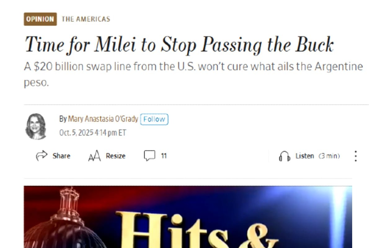 En los primeros párrafos de la nota, que se titula “Es hora de que Milei deje de echar culpas”, Mary Anastasia O’Grady, destacada columnista del medio estadounidense, repasa varios factores que marcan a fuego la administración de Javier Milei tanto en el corto como en el largo plazo. Detalla que “el peso argentino sufrió otro golpe la semana pasada”, cuando el tipo de cambio financiero superó “el límite superior de 1500 pesos por dólar” y que el riesgo país “superó los 1260 puntos”.