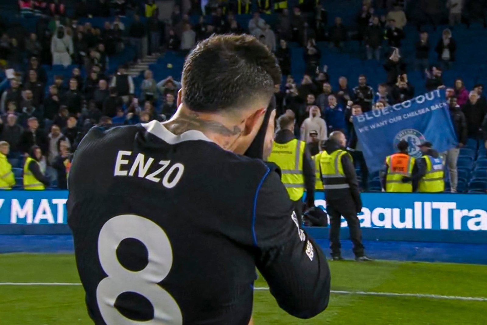 El volante argentino se paró con gesto adusto y la vista hacia una tribuna que ya había quedado raleada, porque muchos hinchas se habían retirado hacía varios minutos, cuando la derrota era irreversible y no se atisbaba ningún tipo de reacción. Los que quedaban mantenían colgada la bandera “BlueCo out”, en referencia a la propiedad del club, que encabeza el empresario estadounidense Todd Boehly.