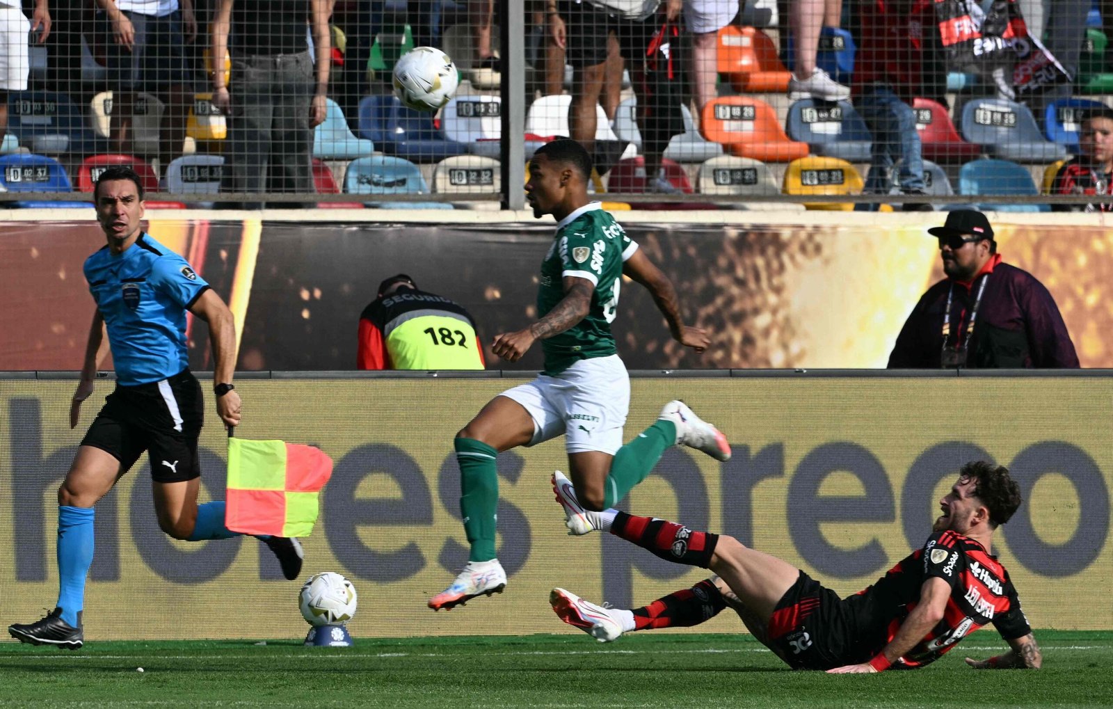 Raphael Veiga bajó con dureza a Jorge Carrascal sobre el sector derecho del ataque de Flamengo. El árbitro dio ley de ventaja y luego sacó tarjeta amarilla.