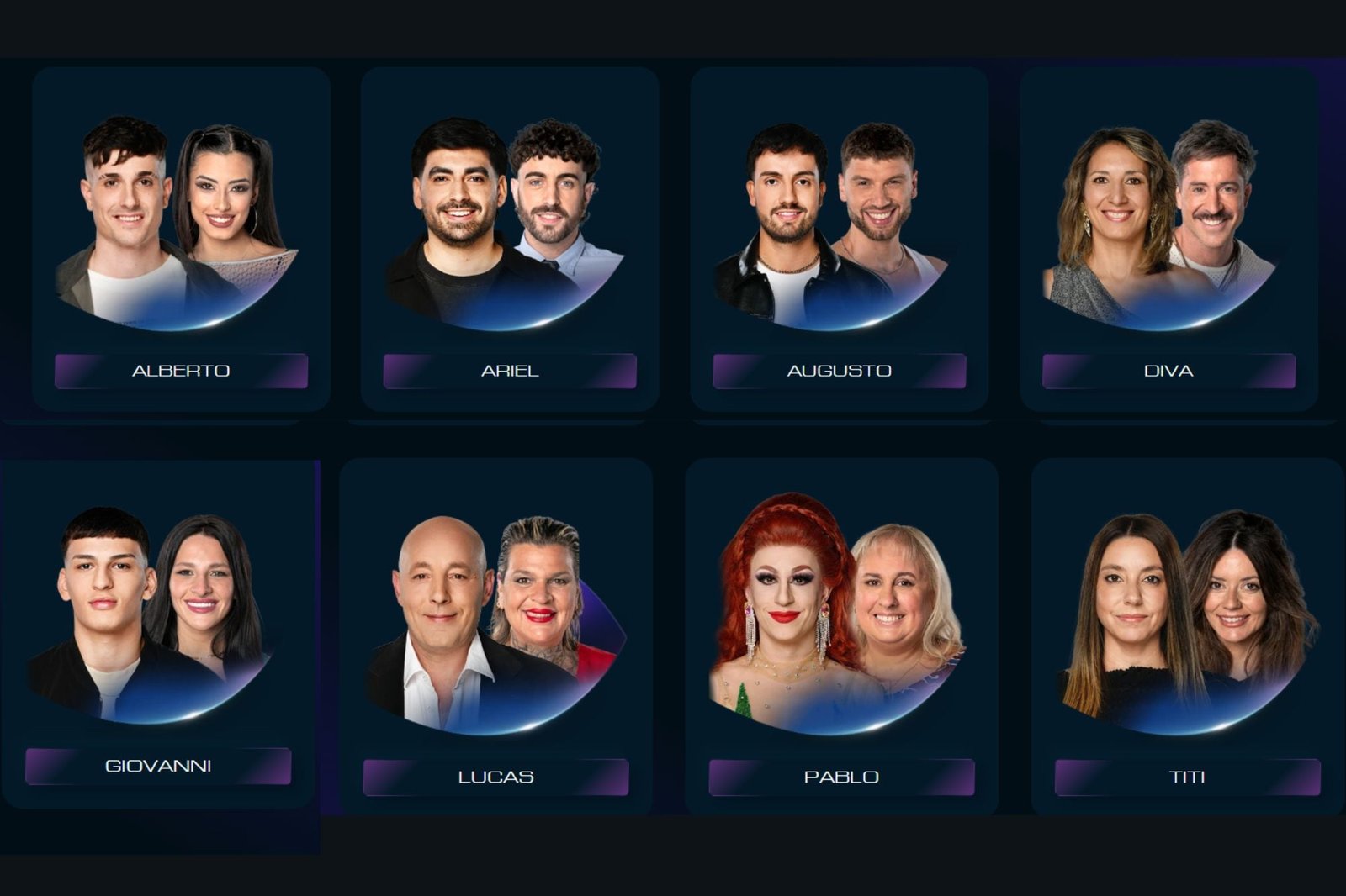 Alberto “Pestañas” (Luz)Ariel (Ulises)Augusto (Tato)Diva (Juan Pablo)Giovanni (Chiara)Lucas (Sandra)Pablo (Selva)Titi (Eugenia)