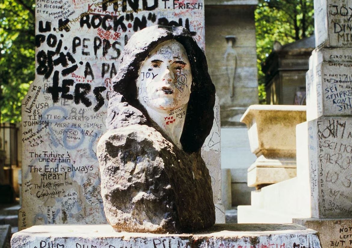 Los guardias del cementerio, durante su patrulla habitual por el recinto de 43 hectáreas, el espacio equivalente a la superficie del Vaticano, una mañana se dieron cuenta de que el busto blanco del cantante colocado sobre su lápida, obra del escultor croata Mladen Mikulin, había desaparecido. La escultura, que ya por entonces se encontraba completamente pintada y garabateada con firmas de visitantes a quienes les parecía una buena idea dejar su rastro en la cara del cantante, había sido colocada ahí en 1981 para conmemorar el décimo aniversario de su muerte. Pero la devoción que levantaba ya el líder de la banda californiana, muerto de sobredosis en París en 3 de julio de 1971, terminó en un extraño robo.