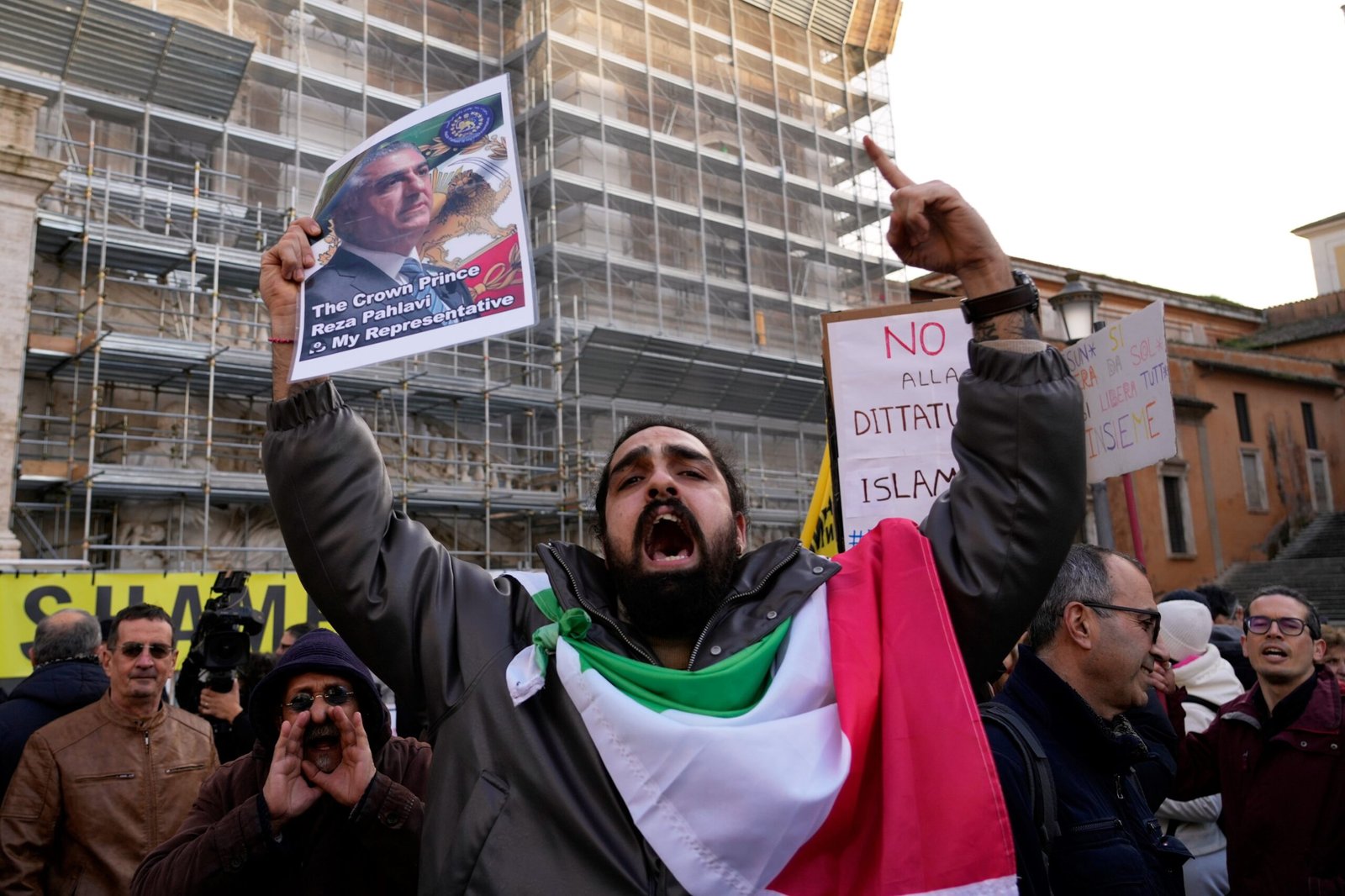 Una fotografía del príncipe heredero exiliado de Irán, Reza Pahlavi, durante una manifestación en apoyo a las protestas antigubernamentales en Irán, frente a la embajada de Estados Unidos en Bucarest, Rumania, en 2026. (AP / Andreea Alexandru)