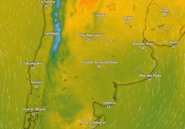 En las provincias de la región cuyana y patagónica se prevén 23°C de máxima y 13°C de mínima en Mendoza; 23°C y 5°C en Río Negro; 22°C y 9°C en Chubut, y 13°C y 5°C en Santa Cruz.