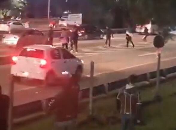 En ese momento, mientras algunos hinchas de Platense se quedaron en la colectora cantando y alentando por su equipo, otros bajaron y comenzaron a lanzar piedras hacia los micros. Así, grupos de fanáticos de River se bajaron y empezó una pelea sobre una avenida completamente frenada.