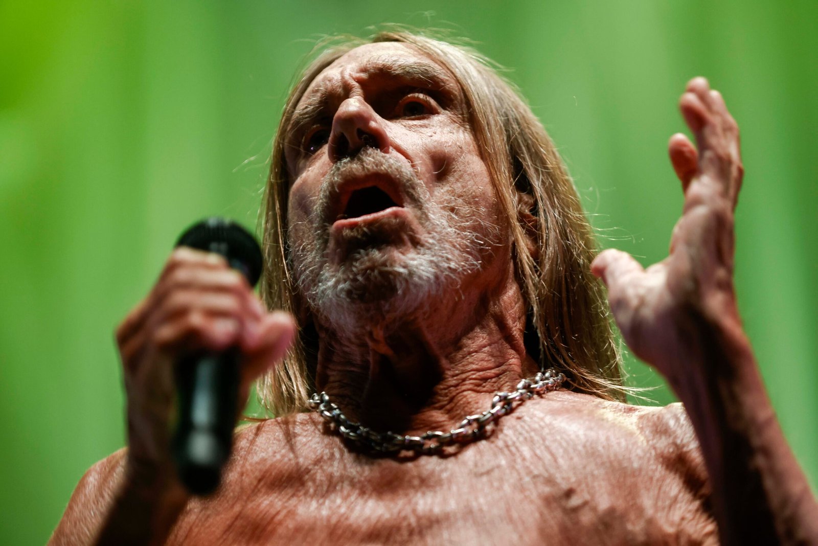 El chaleco dura lo que un suspiro. Apenas se arrima al micrófono, Iggy Pop se lo saca y lo revolea para que un asistente lo recoja. Así, la piel de la “iguana” queda al descubierto. Sin esa voz cavernosa, sin el lacio de la cabellera, sin ese esqueleto y sus fibras no sería Iggy Pop. Y lo que está allí, sobre el escenario, plantado como un tótem que tiene movimiento, es ni más ni menos que aquello que fue, aquello que es (hoy y por estos días, con el show de Buenos Aires) y lo que será en sus próximos conciertos. Porque si hay algo que tiene ese señor de 78 años es que no parece, al menos en escena, un guerrero en retirada si por esto se entiende a todo aquel músico que pasados los setenta largos planea su gira de despedida o, sin decir nada, permite que aquellos que promueven sus shows se tomen el trabajo de venderlos como “última gira”.