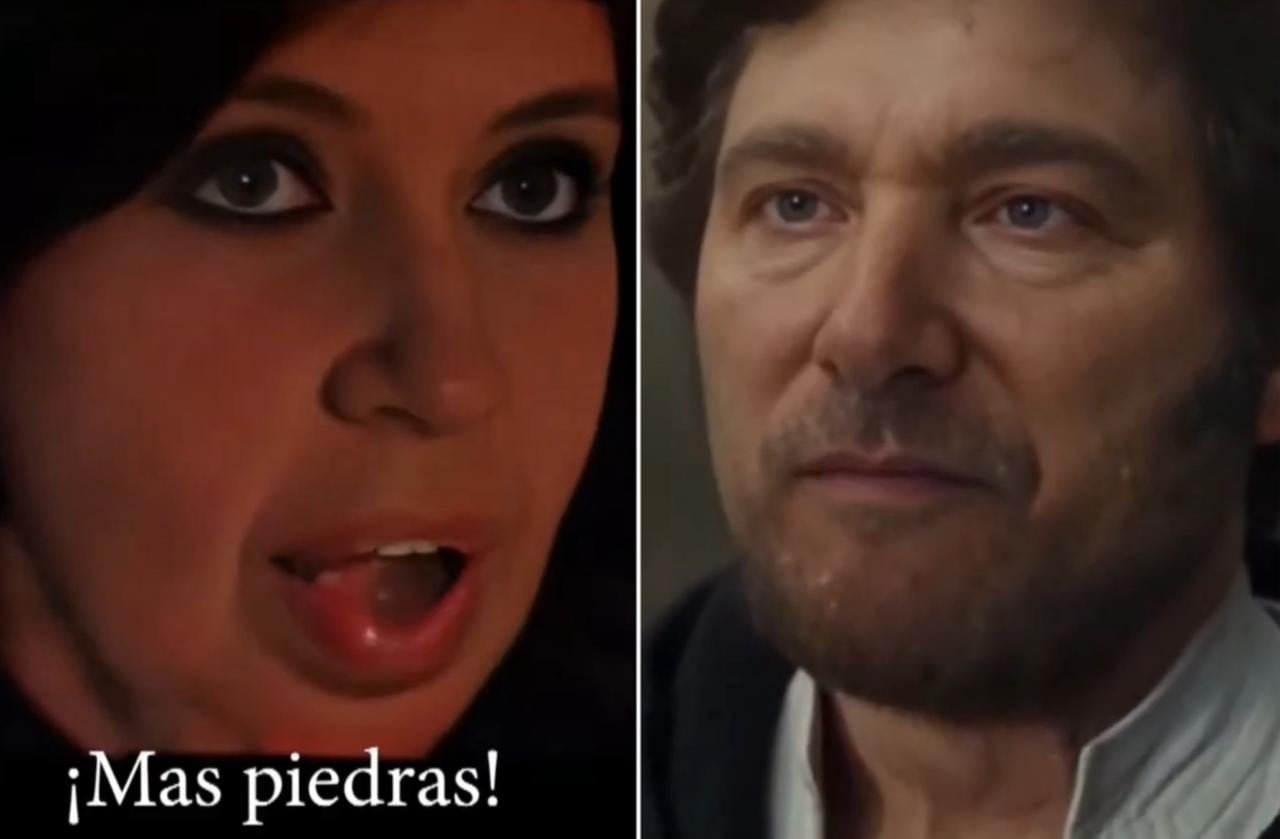Hacelo”, exclama Cristina. “Se le pudió”, contesta Kicillof, dando la orden de atacar a Milei. “Más”, pide el personaje de la expresidenta para que continúe el asedio aunque en los subtítulos se lo traduce como “más operetas” y “más piedras”.