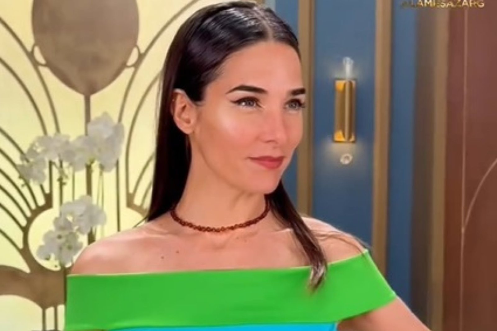 “Miren qué lindos estos colores, alegres, encendidos, transparentes… Todo esto es sinónimo de Bogani. Sinónimo de elegancia”, dijo la conductora y luego señaló: “Es un body all shoulder con banda verde. Compuesto de una pollera de gasa tableada con cinturón al tono gris”.