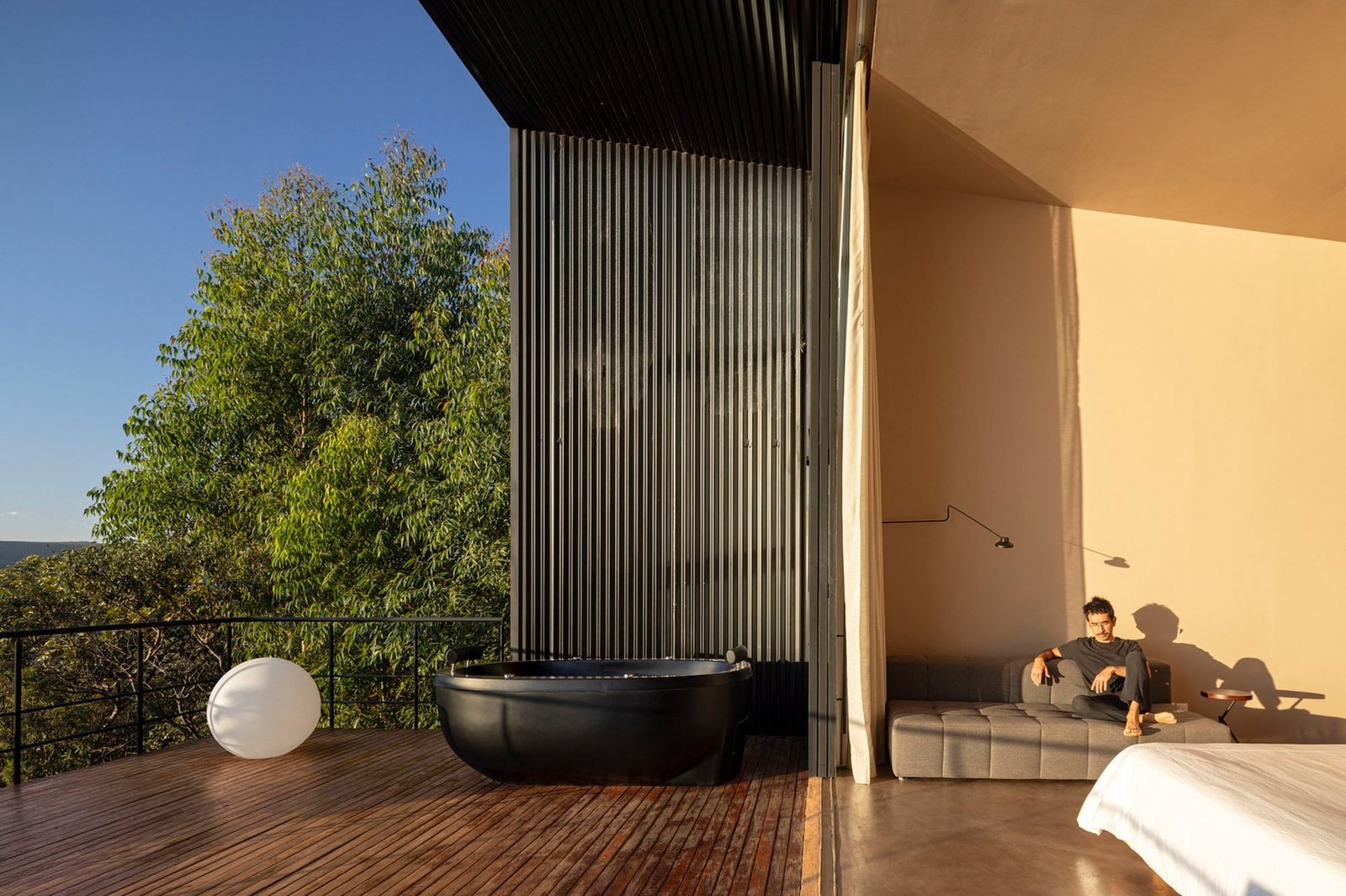 Desde la habitación central, las puertas de cristal se abren a una espaciosa terraza de madera en las copas de los árboles. Aquí, los afortunados huéspedes que alquilen la residencia por US$141 la noche tienen la oportunidad de relajarse en un jacuzzi, disfrutando de la tranquilidad y la belleza natural que ofrece este rincón especial de Alto Paraíso de Goiás.