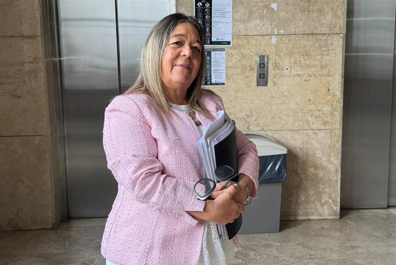 Necheveko, de saco rosa, botas cortas y grandes anteojos, llegó temprano a los tribunales de Retiro y permaneció en el café de la planta baja hasta pasadas las 10, cuando subió a la cita con el fiscal, en el quinto piso.