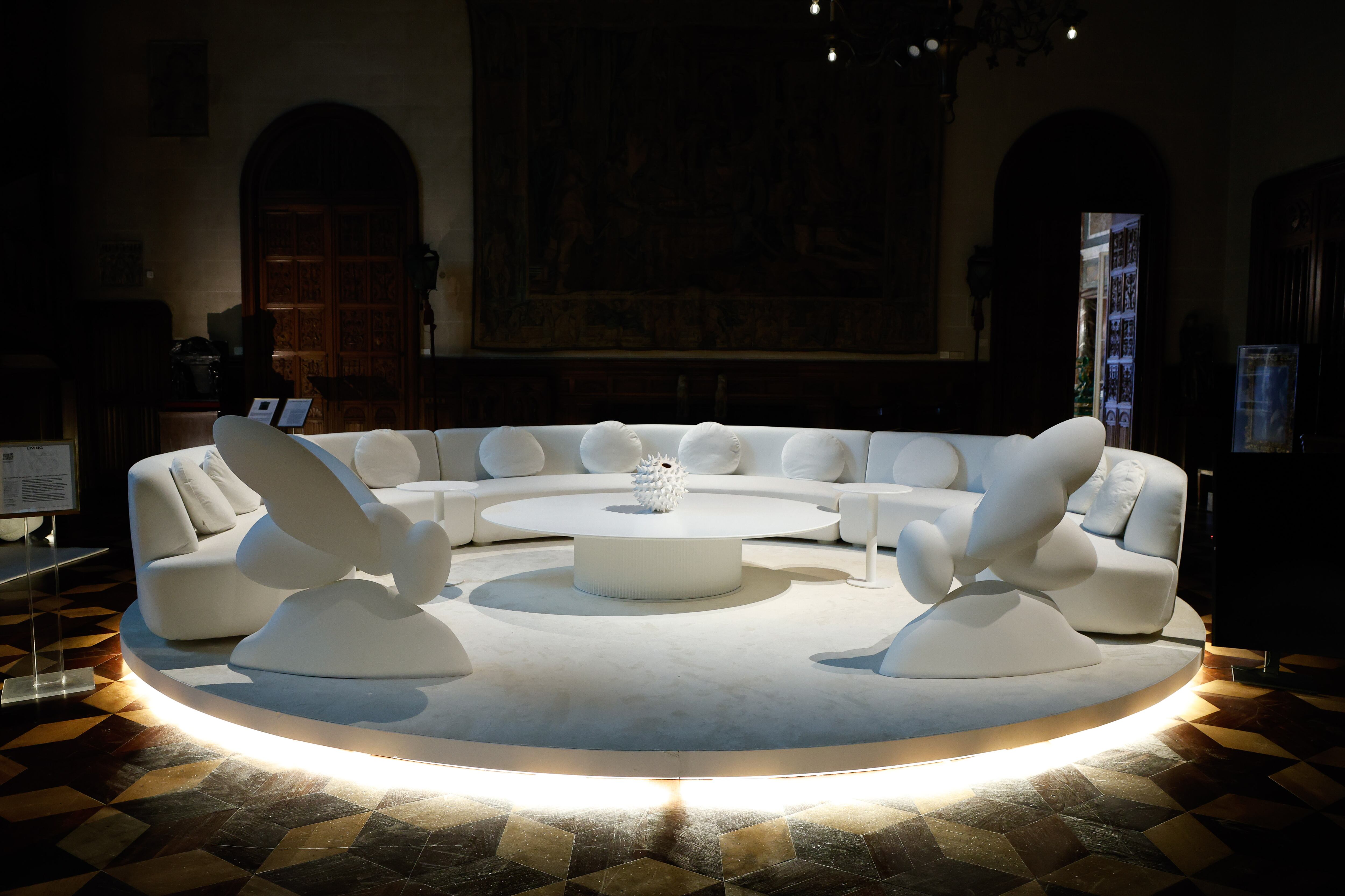 Es ámbito de reunión con eje en el Sofá O de tres módulos tapizados en terciopelo de algodón y doce almohadones con grabado láser con los signos del zodíaco.