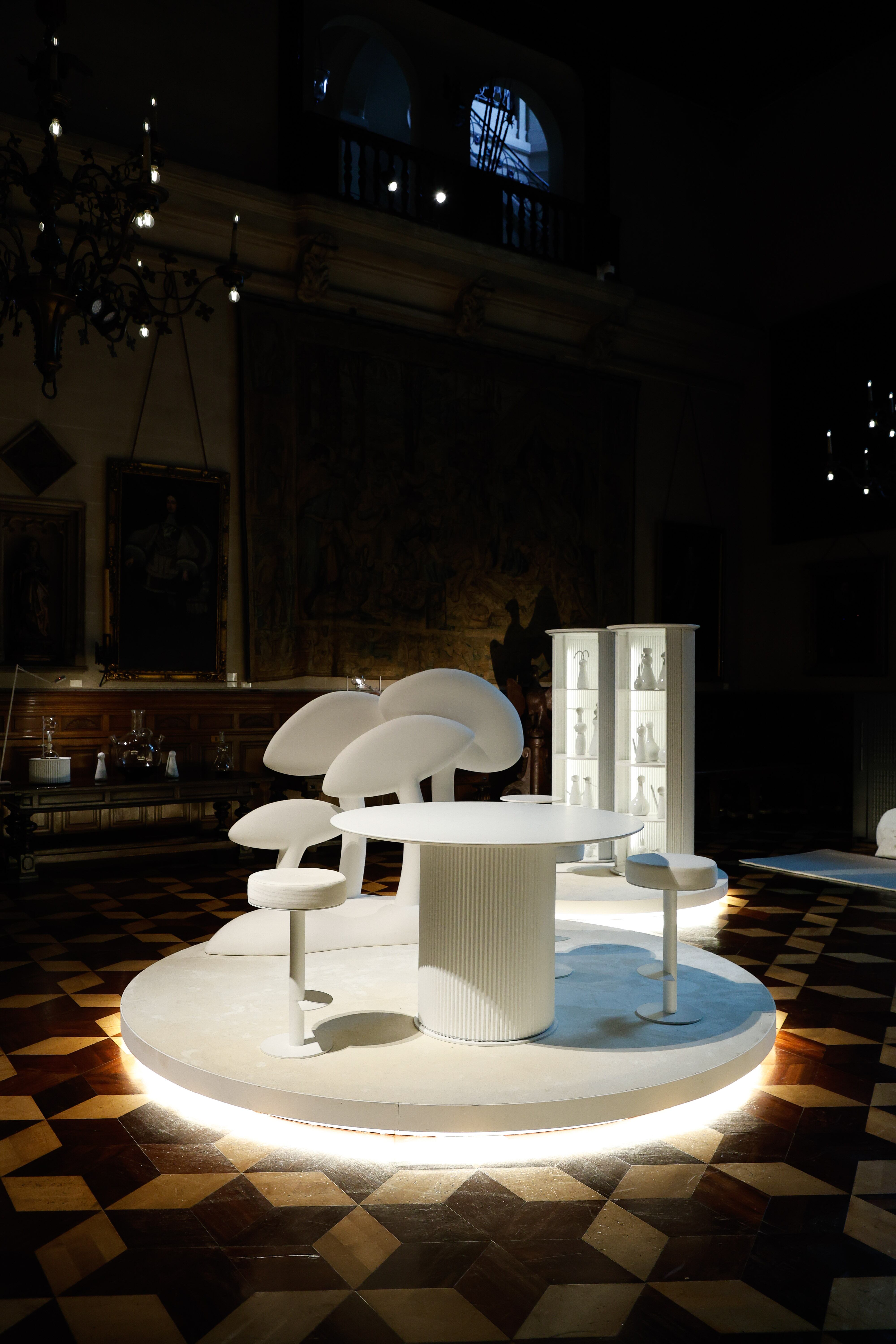 Tanto la mesa como la Biblioteca O, en hierro y chapa microondulada, están salpicadas por bacterias que son obras de Bairon y rocas de Martina Quesada, realizadas en cerámica, mármol en polvo, cemento blanco y cuarzo.
