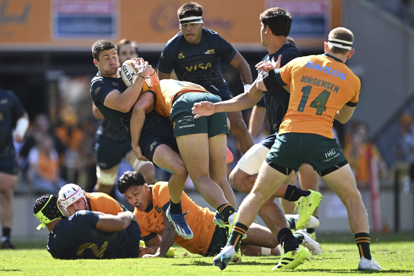 Andrew Kellaway deja en el suelo a Lucio Cinti y se aleja de Mateo Carreras; en el final, Australia tuvo premio a su búsqueda frente a los Pumas.