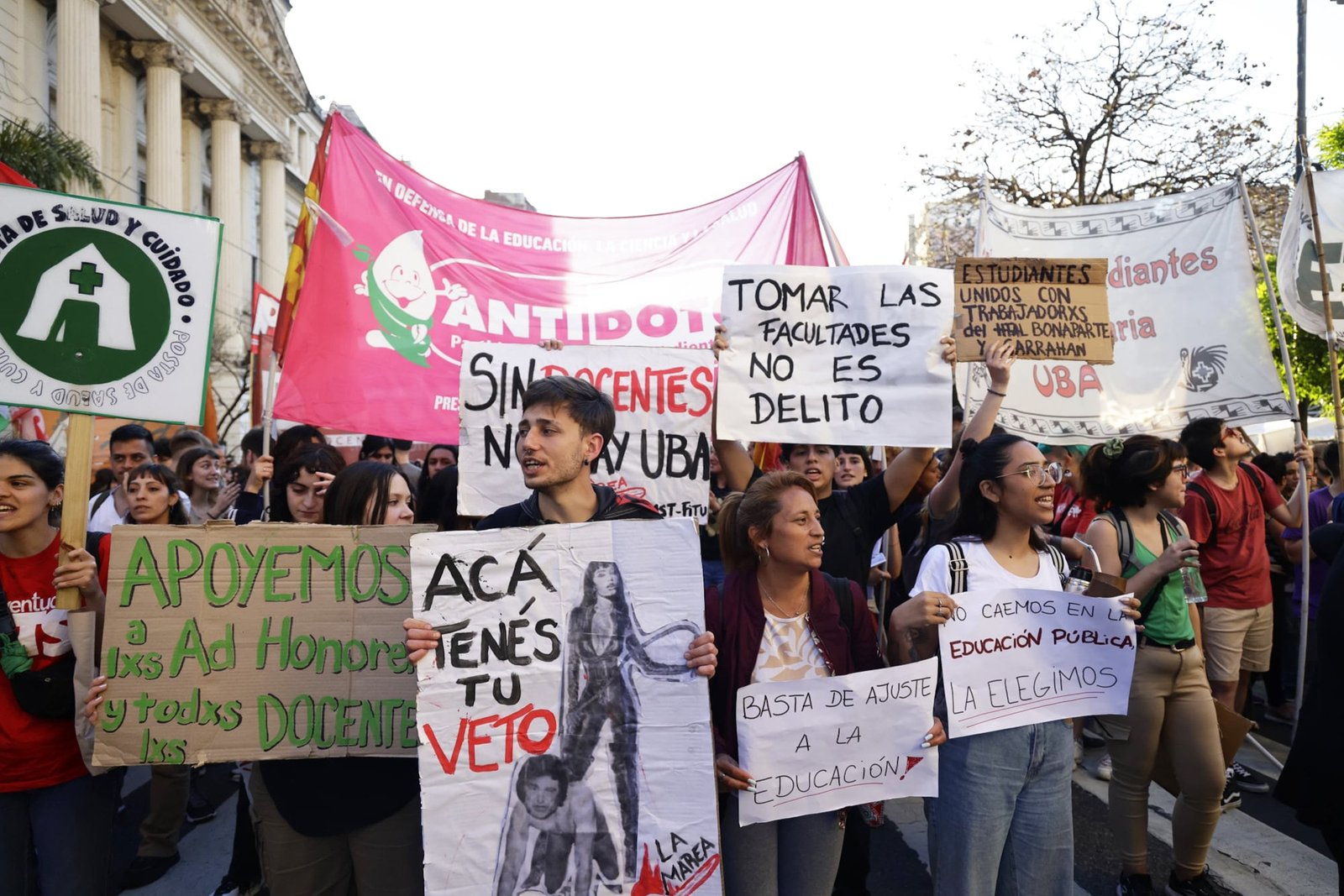 En la Facultad de Ciencias Sociales de la UBA una pintada en letras grandes resume el clima de estos días: “No al veto”. Afiches pegados en las rejas repiten la consigna junto a la hora de la marcha, mientras adentro, en distintos sectores, los estudiantes preparan pancartas y carteles para llevar a la movilización.