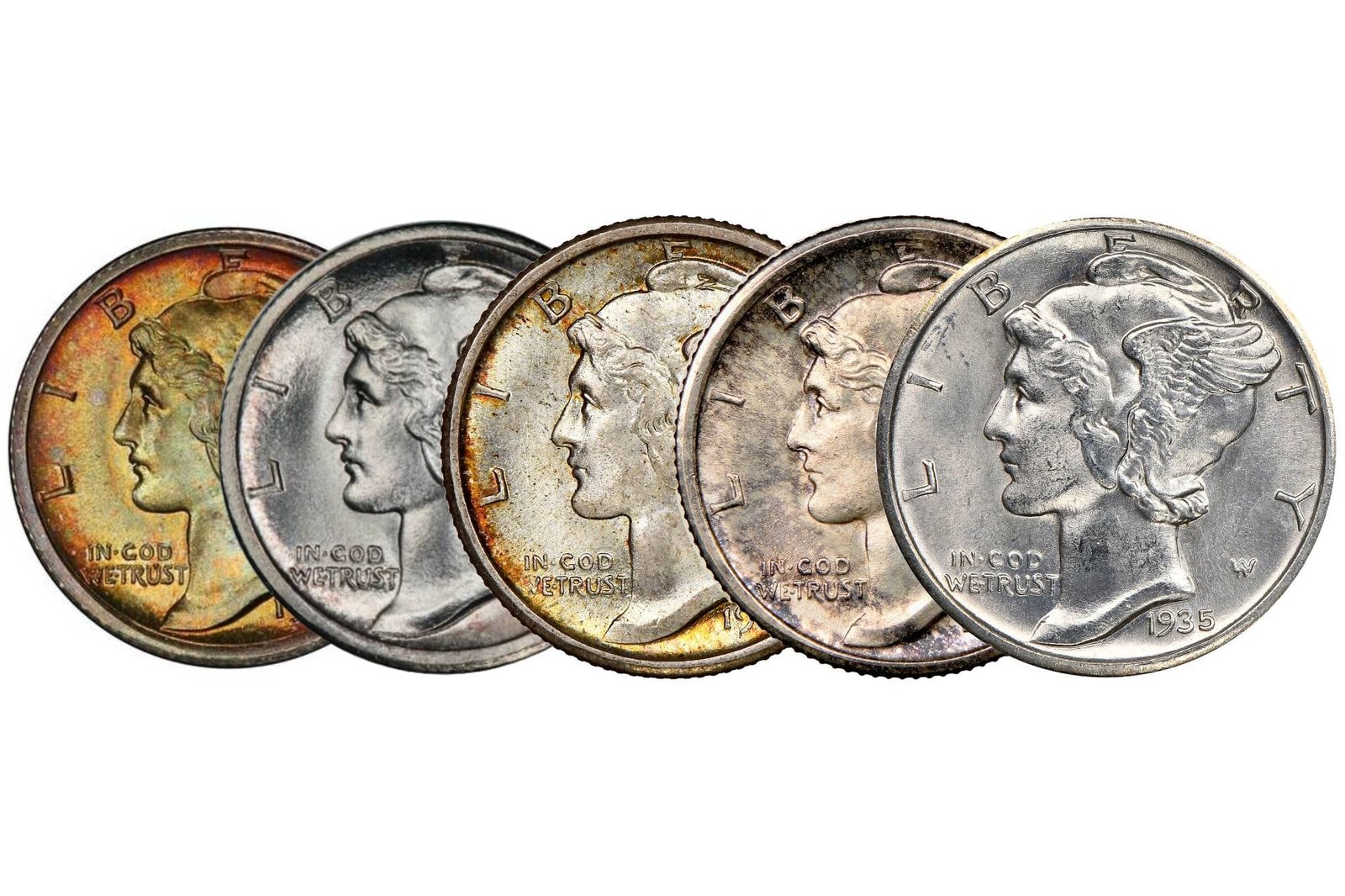 De acuerdo con el Servicio Profesional de Calificación de Monedas (PCGS, por sus siglas en inglés), durante las primeras décadas del siglo XX, Estados Unidos introdujo un rediseño para sus monedas de diez centavos. A partir de 1916, el rostro de la Libertad con un gorro alado reemplazó al diseño de Barber, vigente desde 1892. Esta imagen, similar al dios romano Mercurio, le dio a esta serie el apodo de “Mercury Dimes”.