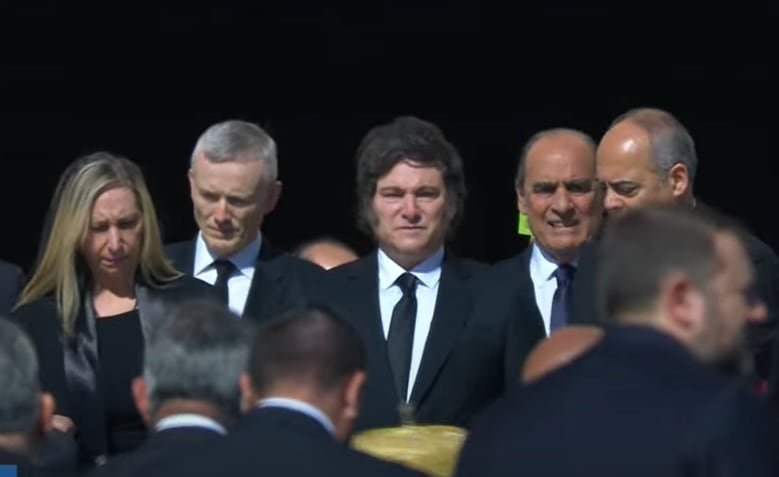 El Presidente vuelve a cruzarse hoy con Donald Trump, el líder mundial que más admira. Vestido con un llamativo traje azul, Trump también observa el funeral en la primera fila, pero alejado de la ubicación de Milei.
