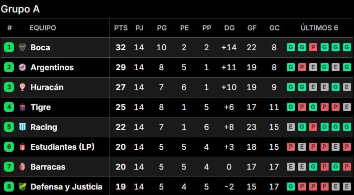 En la zona A los equipos que ya sacaron pasaje a la siguiente ronda son Boca, líder de la tabla de posiciones con 32 puntos gracias a su triunfo sobre Estudiantes de La Plata por 2 a 0, Argentinos Juniors (29), Huracán (27) y Tigre (25), que se aseguró la clasificación con el empate 0 a 0 ante Belgrano de Córdoba.