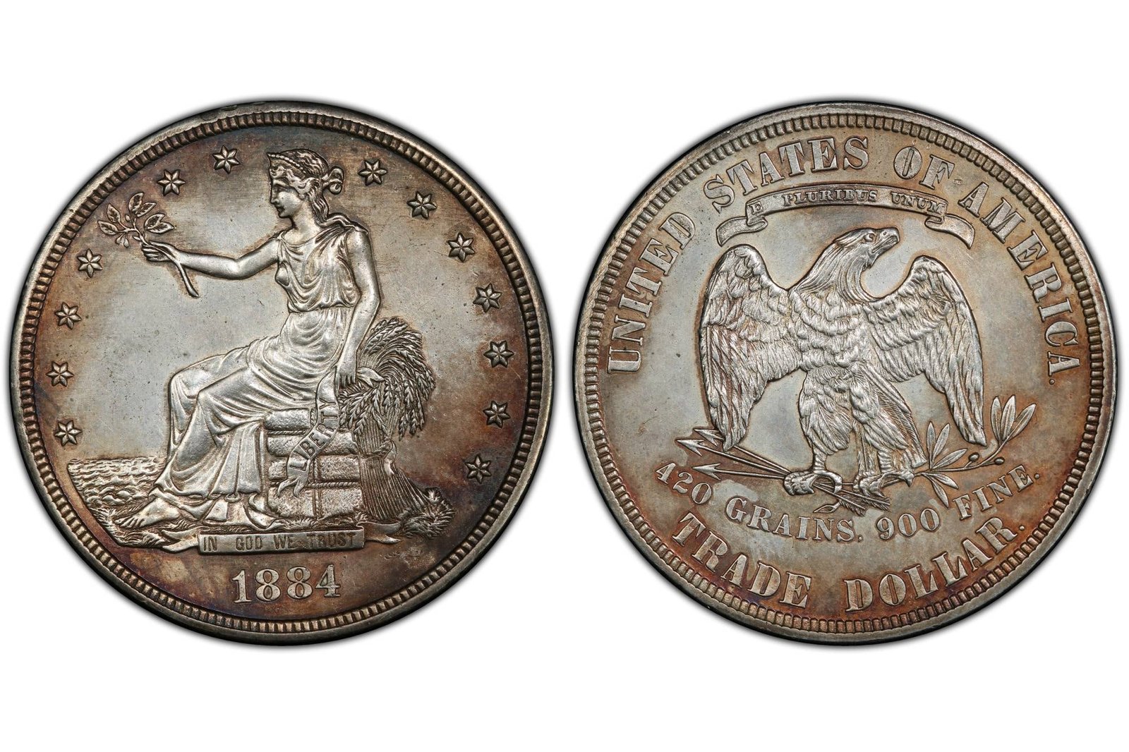 Dentro de este contexto, el Trade Dollar o dólar comercial de 1884 clasificado como J-1732, es uno de los ejemplos más relevantes. Se trata de un prototipo acuñado en cobre con borde estriado y posteriormente plateado. Solo se conocen dos ejemplares de esta variante, lo que incrementa su valor de mercado.