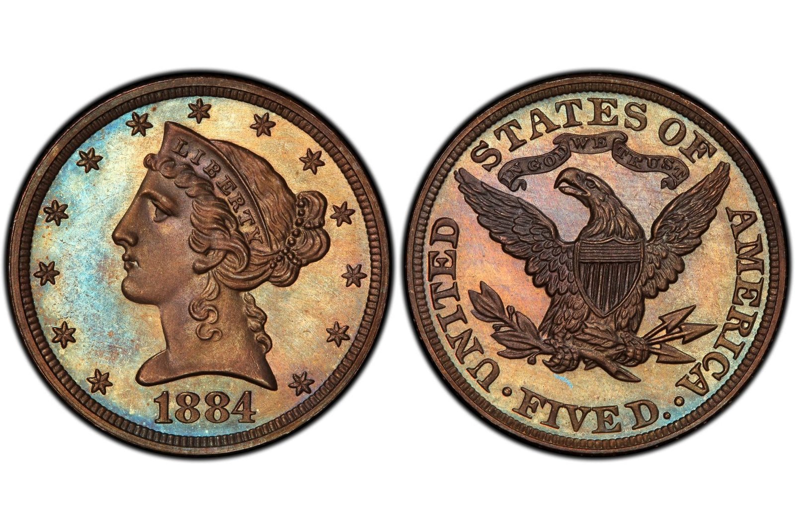 En el caso de las de US$5 emitidas en 1884, las conocidas como “Patterns Proof” representan un caso singular debido a la falta de documentación precisa y a su aparición limitada en el mercado. Se considera que estas piezas formaron parte de un conjunto experimental de pruebas en cobre que abarcaba varias denominaciones, desde fracciones menores hasta valores altos como el doble águila.