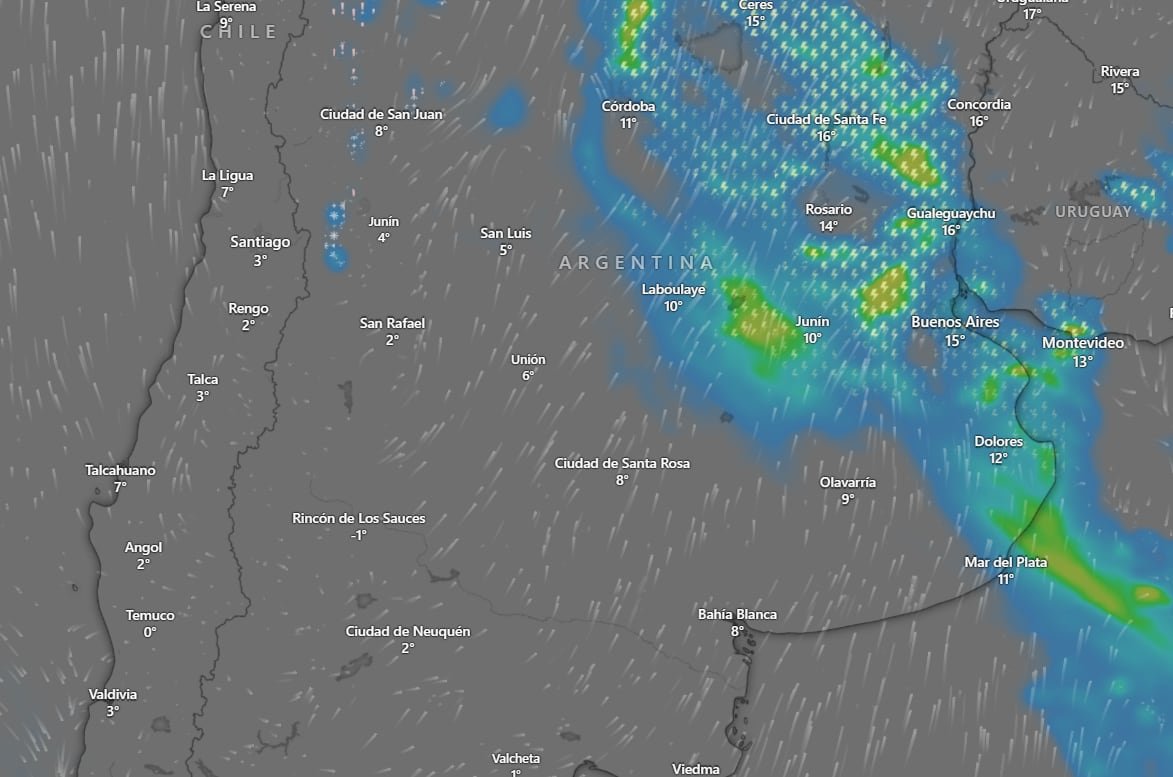 Este fenómeno adquirirá mucho intensidad durante la madrugada de mañana del martes dejando fuertes precipitaciones. En algunos puntos del sur del Litoral y norte de la provincia de Buenos Aires podrían alcanzar los 80 mm en menos de 24 horas.