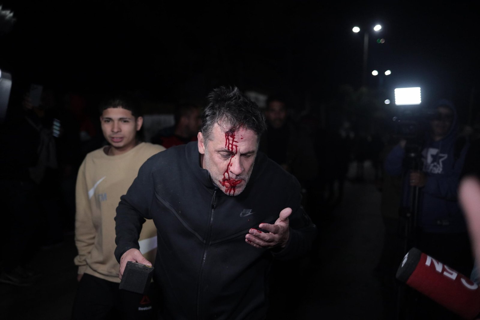 “Me pegó una botella. Estaba haciéndole una entrevista a los encapuchados [un grupo de personas que apareció en las inmediaciones del acto] y voló una botella. Fui a preguntarles si eran personal policial porque la gente estaba enojada con ellos. No me contestaron, me di vuelta y sentí el golpe. No sé quién fue. No puedo echar culpas. Estoy bien”, expresó, en diálogo con la prensa, ensangrentado y con una venda en la cabeza.