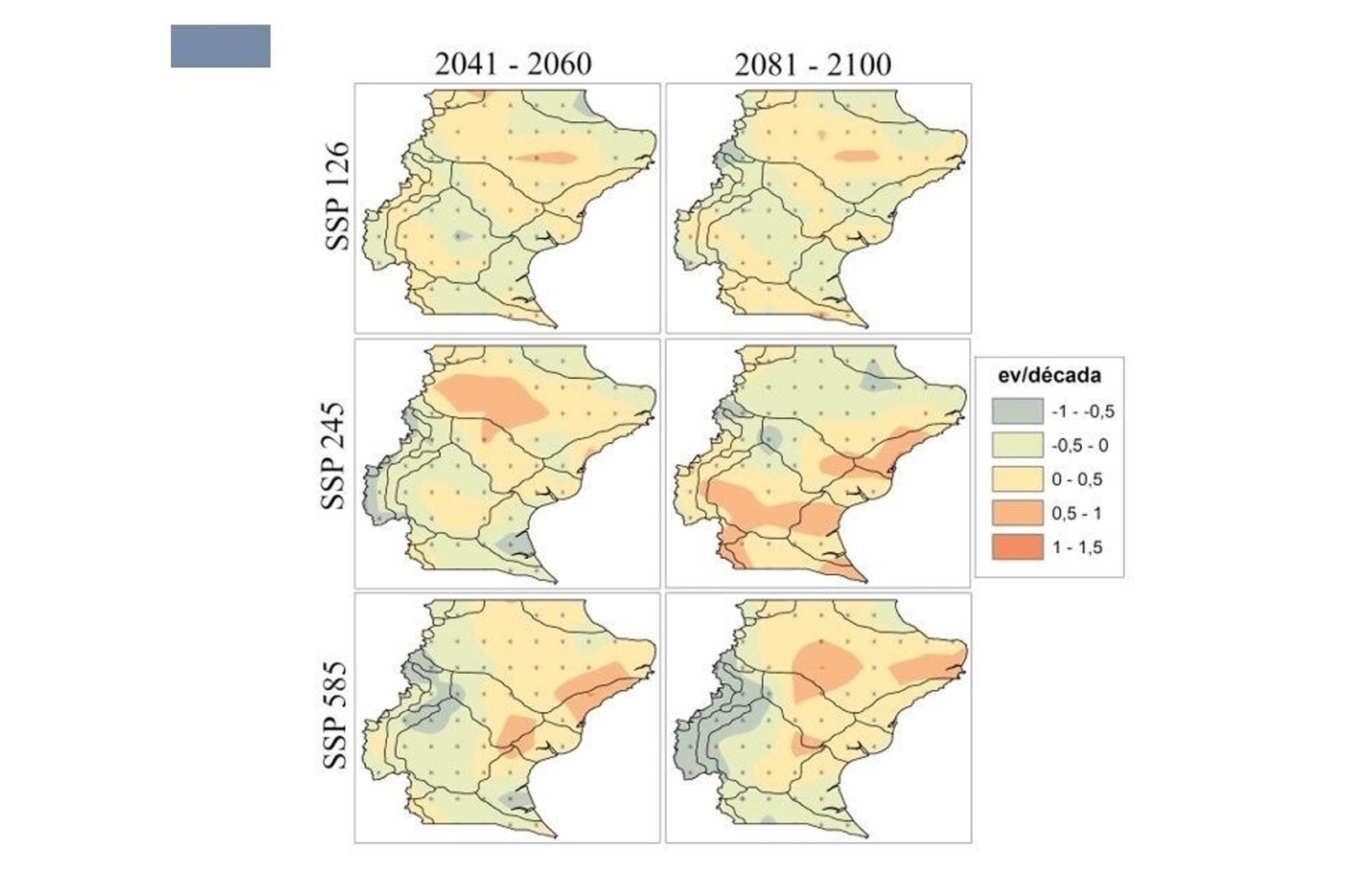 A partir de allí establecieron once regiones climáticas para la provincia y los resultados fueron contundentes: gran parte del territorio ya muestra una tendencia negativa en las lluvias y el panorama podría volverse aún más crítico hacia el año 2100.