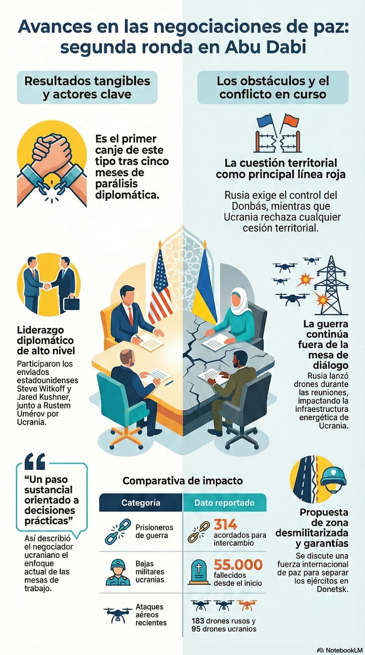 ​Las negociaciones de paz trilaterales entre Ucrania, Rusia y Estados Unidos en Abu Dabi arrojaron este jueves su primer resultado concreto: un acuerdo para el intercambio de 314 prisioneros de guerra.El enviado especial de Donald Trump, Steve Witkoff, confirmó el pacto y calificó las conversaciones de “productivas”, pese a que los combates continúan activos en el frente.Este consenso marca la reanudación de los canjes humanitarios, que se encontraban interrumpidos desde hacía cinco meses, en un conflicto que ya se extiende por casi cuatro años.“Si bien aún queda mucho trabajo por hacer, pasos como este demuestran que la colaboración diplomática sostenida está dando resultados tangibles”, expresó Witkoff a través de la red social X.Diálogo “sustancial” y optimismo en WashingtonLa segunda ronda de negociaciones en los Emiratos Árabes Unidos reunió a delegaciones de alto perfil. Por Estados Unidos participaron el asesor Jared Kushner y el general de la Otan Alexus Grynkewich.El negociador ucraniano Rustem Umerov describió el encuentro como “sustancial y productivo”, destacando que el trabajo estuvo orientado a “pasos concretos y decisiones prácticas”.Desde el Despacho Oval, el presidente Donald Trump se mostró optimista sobre el desarrollo de las gestiones. “Nos está yendo muy bien con Ucrania y Rusia. Creo que vamos a tener buenas noticias”, aseguró el mandatario.Paralelamente, funcionarios rusos mantienen reuniones con la administración estadounidense para intentar restablecer relaciones económicas, según confirmó Kirill Dmitriev, del Fondo Ruso de Inversión Directa.El nudo del conflicto: territorios y seguridadPese al avance en materia humanitaria, las discrepancias sobre el futuro de los territorios ocupados siguen siendo profundas y amenazan el éxito final del proceso.Moscú exige la retirada de las fuerzas ucranianas del Donbás y el reconocimiento internacional de su control sobre áreas anexadas, incluidas Lugansk y Zaporizhzhia.Rusia aspira a que Ucrania ceda entre el 20% y el 25% de lo que queda bajo su control en Donetsk, una condición que Kiev rechaza tajantemente.El presidente Volodimir Zelensky definió la cesión del Donbás como una “línea roja”. “Los rusos deben hacer lo mismo si hablamos de una zona desmilitarizada”, advirtió en una entrevista con la cadena France 2.Uno de los borradores que discuten las partes contempla congelar el frente en las provincias de Zaporizhzhia y Jersón, mientras que los rusos se retirarían de zonas ocupadas en Sumi y Járkov.Guerra de desgaste y cifras de bajasMientras la diplomacia avanza a puertas cerradas, la violencia no cesa en el terreno. Rusia lanzó un ataque masivo con 183 drones y dos misiles balísticos contra infraestructura energética ucraniana en las últimas horas.En este contexto, Zelensky actualizó las cifras oficiales de bajas militares: confirmó que 55.000 soldados ucranianos han muerto desde el inicio de la invasión, un aumento respecto a los 46.000 reportados a principios de 2025.La situación de los civiles también es crítica. Organismos internacionales reportan un aumento del 31% en las bajas civiles durante el último año, superando los 15.000 fallecidos según datos de la ONU.El mandatario ucraniano insistió en que su país necesita garantías de seguridad de Estados Unidos y Europa para “disuadir cualquier ataque ruso posterior a la guerra”.Sin embargo, Moscú advirtió que cualquier despliegue de tropas extranjeras o de una coalición de voluntarios será considerado un “objetivo militar legítimo”.  La Voz