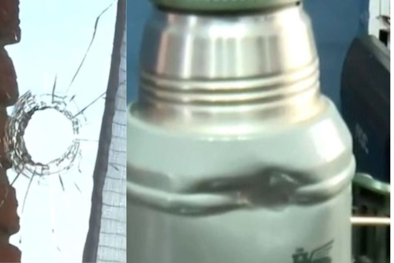 Al revisar la escena, descubrieron un orificio en la ventana y el termo abollado debajo de la mesa. Cerca del objeto se encontraba el casco del proyectil.