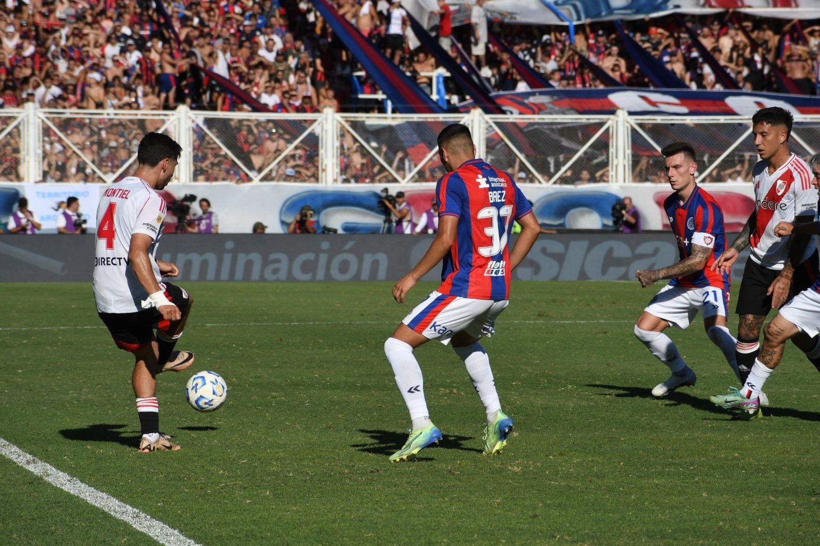 San Lorenzo es pura actitud. Presió en bloque y recuperación rápida. River no encuentra la pelota y no puede salir limpio.