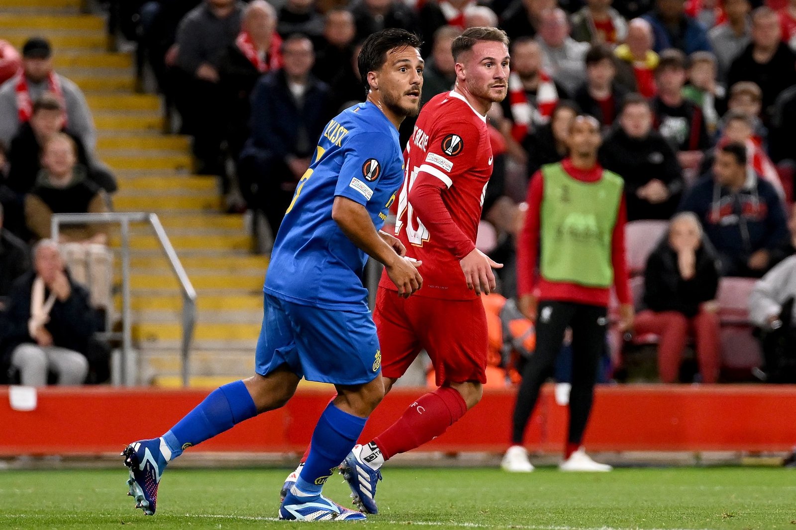 Kevin Mac Allister, de Union Saint-Gilloise, con su hermano Alexis, de Liverpool, en un partido de la Europa League que se jugó en Anfield en octubre de 2023